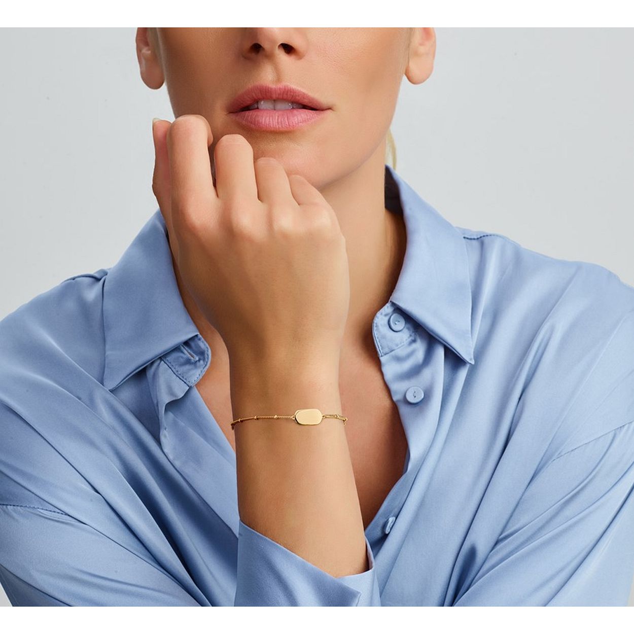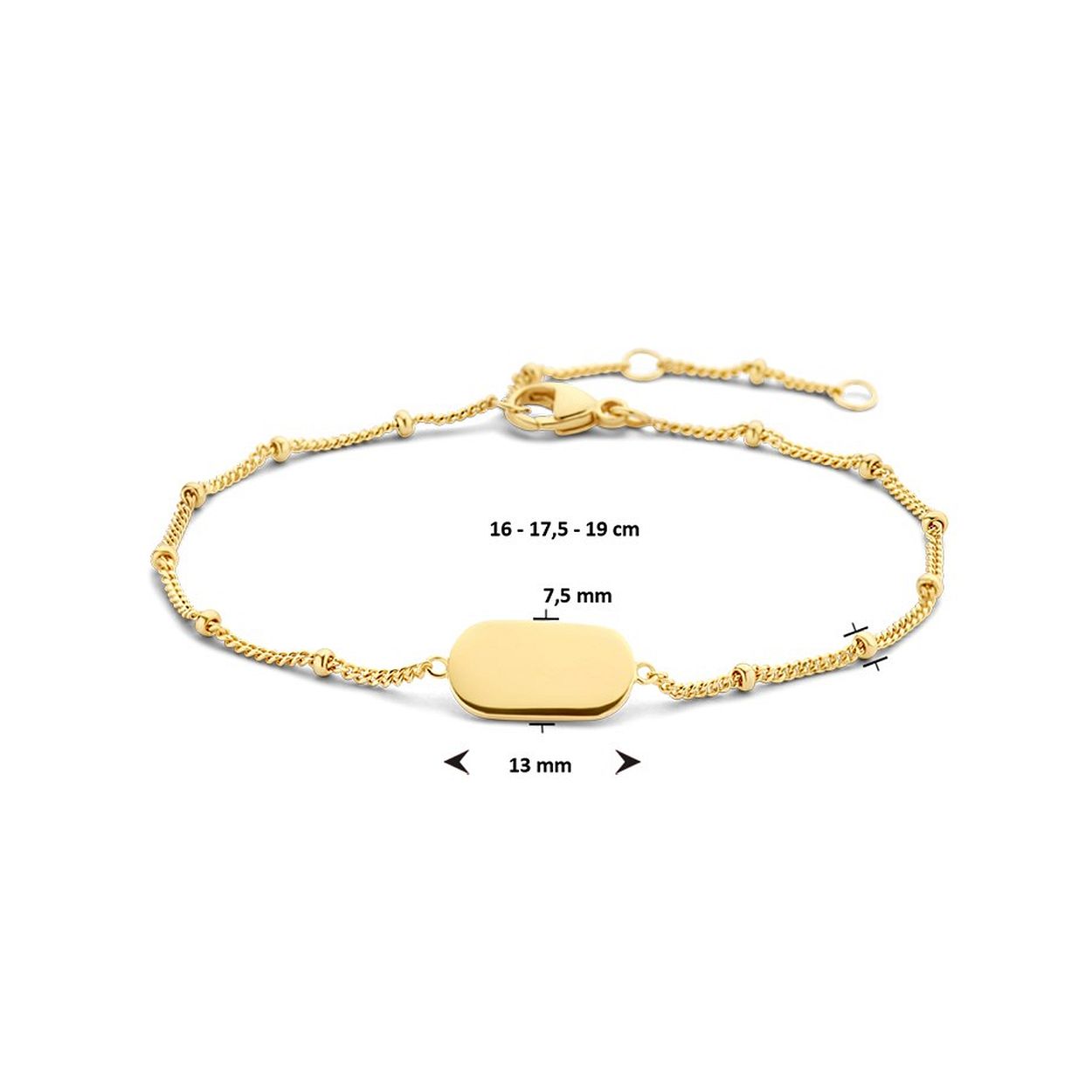 Geelgoud op 925 zilveren armband uitgevoerd met een dog tag van 7.5x13mm en een stevige karabijn sluiting. De armband heeft een breedte van 7.5mm en draaglengtes van 16, 17.5 en 19cm.