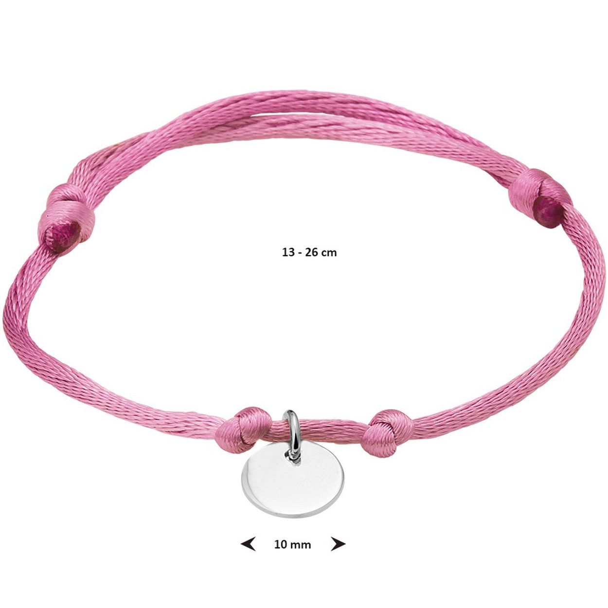 Roze gevlochten armband uitgevoerd met een gerhodineerd 925 zilveren rondje. De armband heeft draaglengtes van 13 tot 26cm. Het rondje heeft een diameter van 10mm.