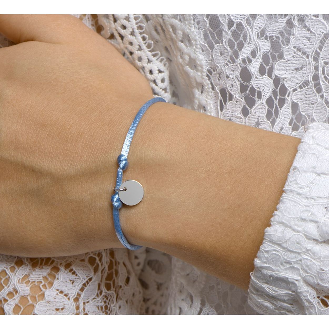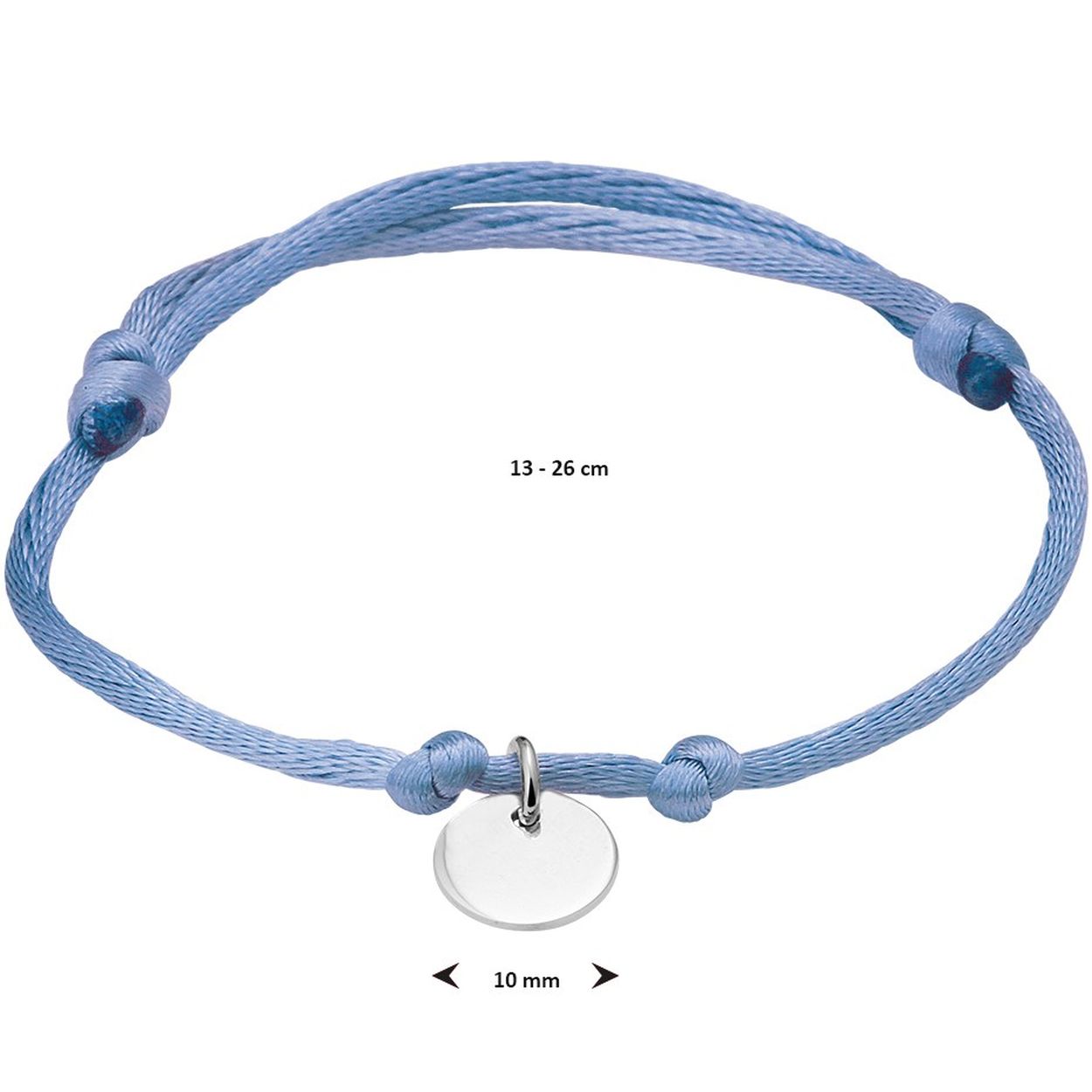 Lichtblauw gevlochten armband uitgevoerd met een gerhodineerd 925 zilveren rondje. De armband heeft draaglengtes van 13 tot 26cm. Het rondje heeft een diameter van 10mm.