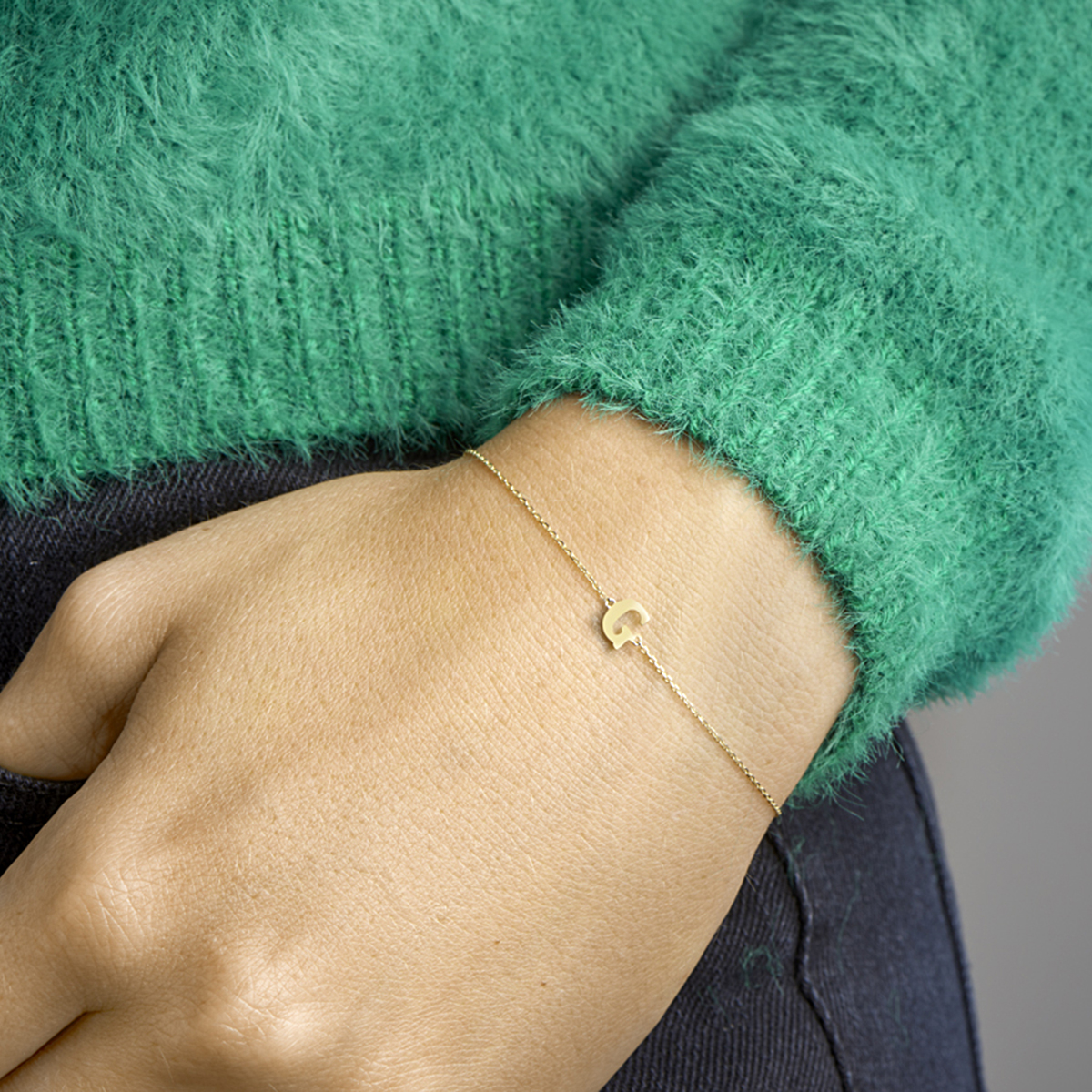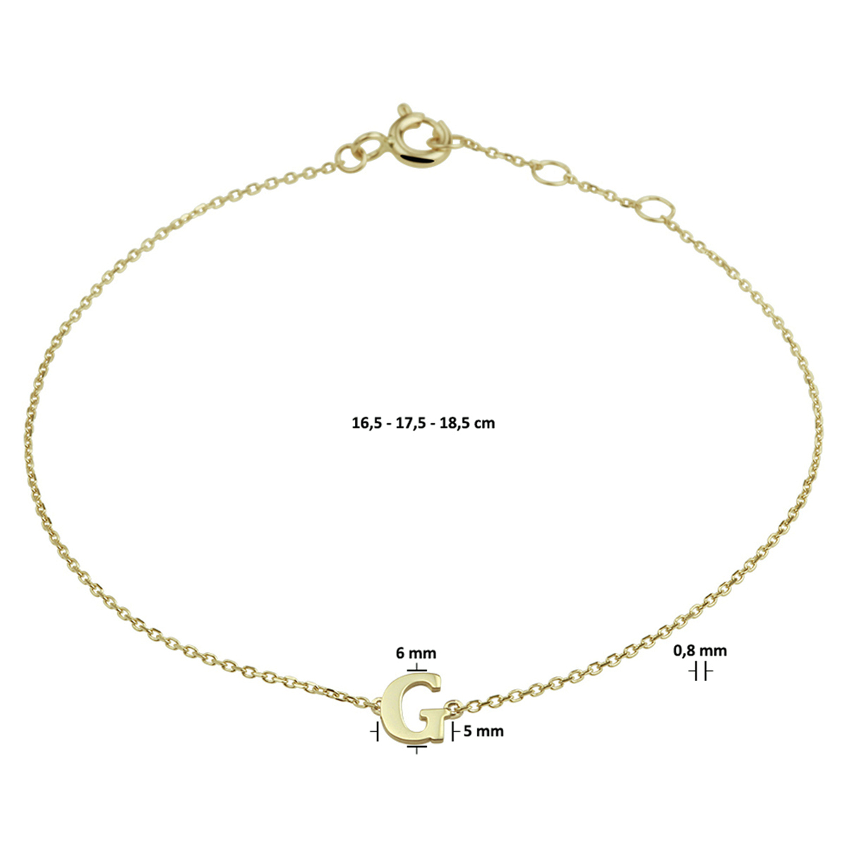 14k Geelgouden anker armband uitgevoerd met de letter G. De armband heeft draaglengtes van 16.5, 17.5 en 18.5cm. De letter heeft een afmeting van 6x5mm.