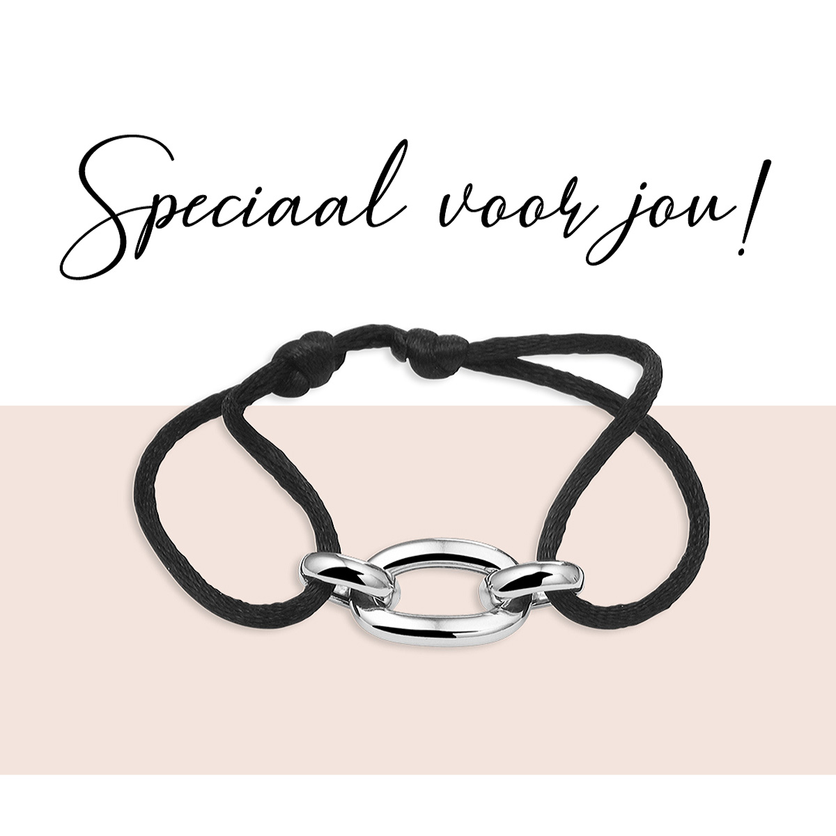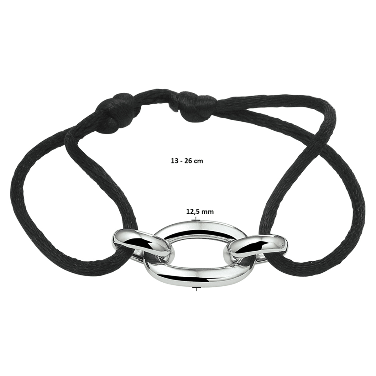 Zwart gevlochten armband uitgevoerd met gerhodineerd 925 zilveren schakels. De armband heeft draaglengtes van 13 tot 26cm.