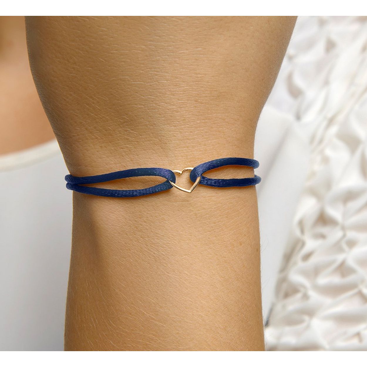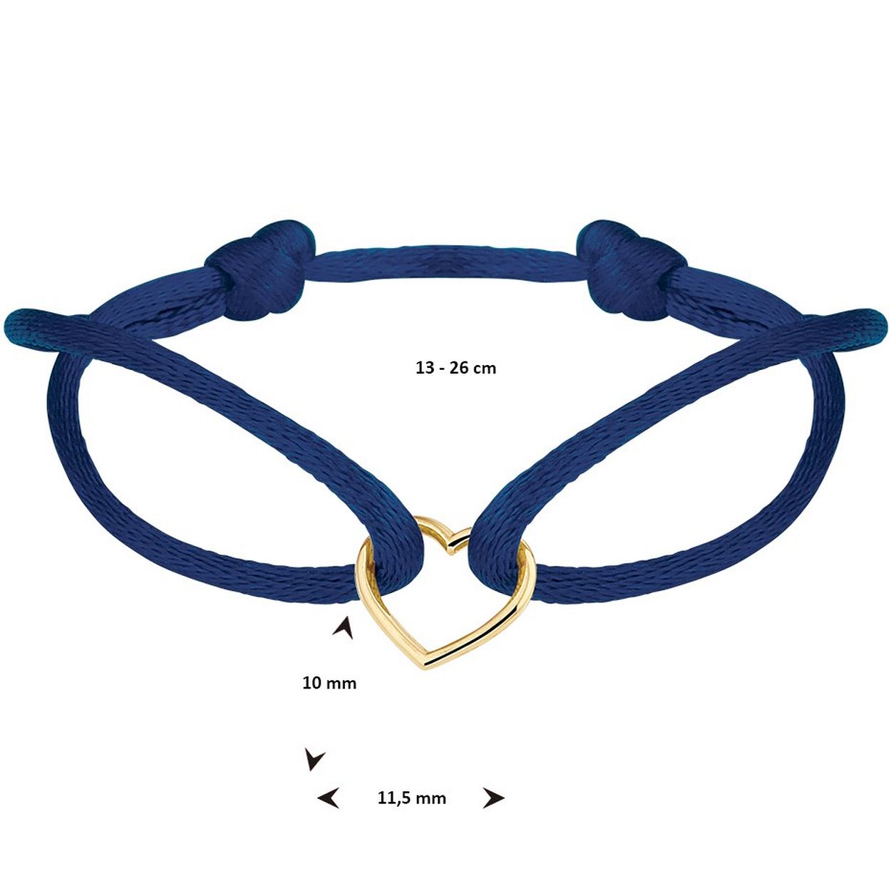 Donkerblauw gevlochten armband uitgevoerd met een 14k geelgouden hartje. De armband heeft draaglengtes van 13 tot 26cm. Het hartje heeft een afmeting van 10x11.5mm.