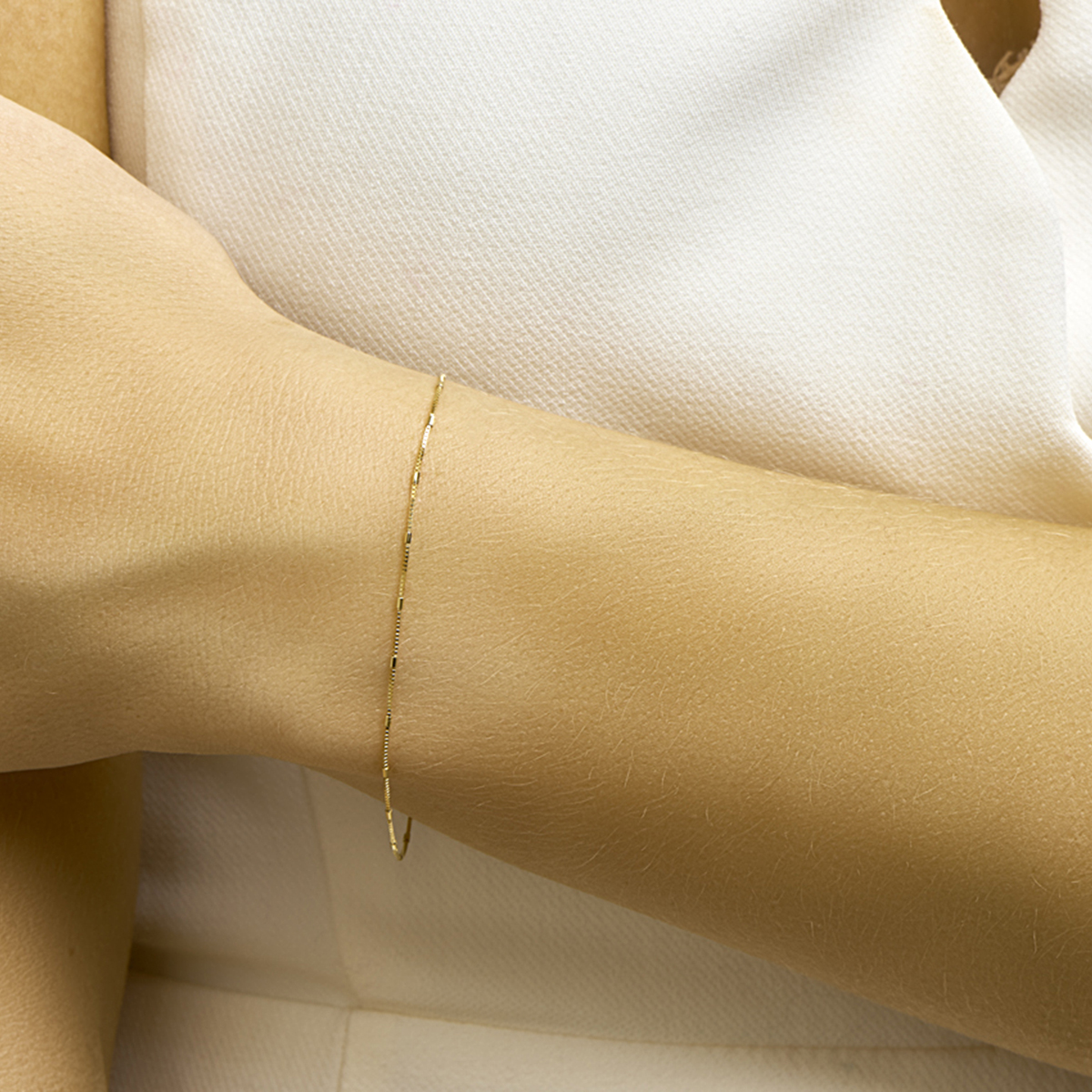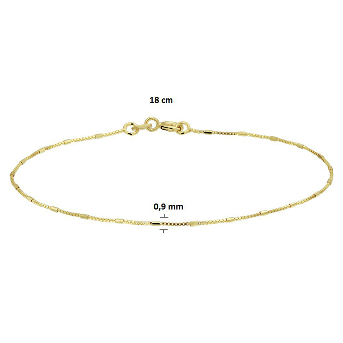Geelgouden 0.9mm venetiaanse armband uitgevoerd met staafjes en stevige veerring sluiting.