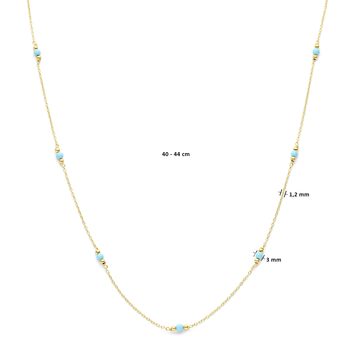 14k Geelgouden collier uitgevoerd met bolletjes en turquoise. Het collier heeft draaglengtes van 40-44cm en een schakelbreedte van 1.2mm. Uitgevoerd met een karabijn sluiting.