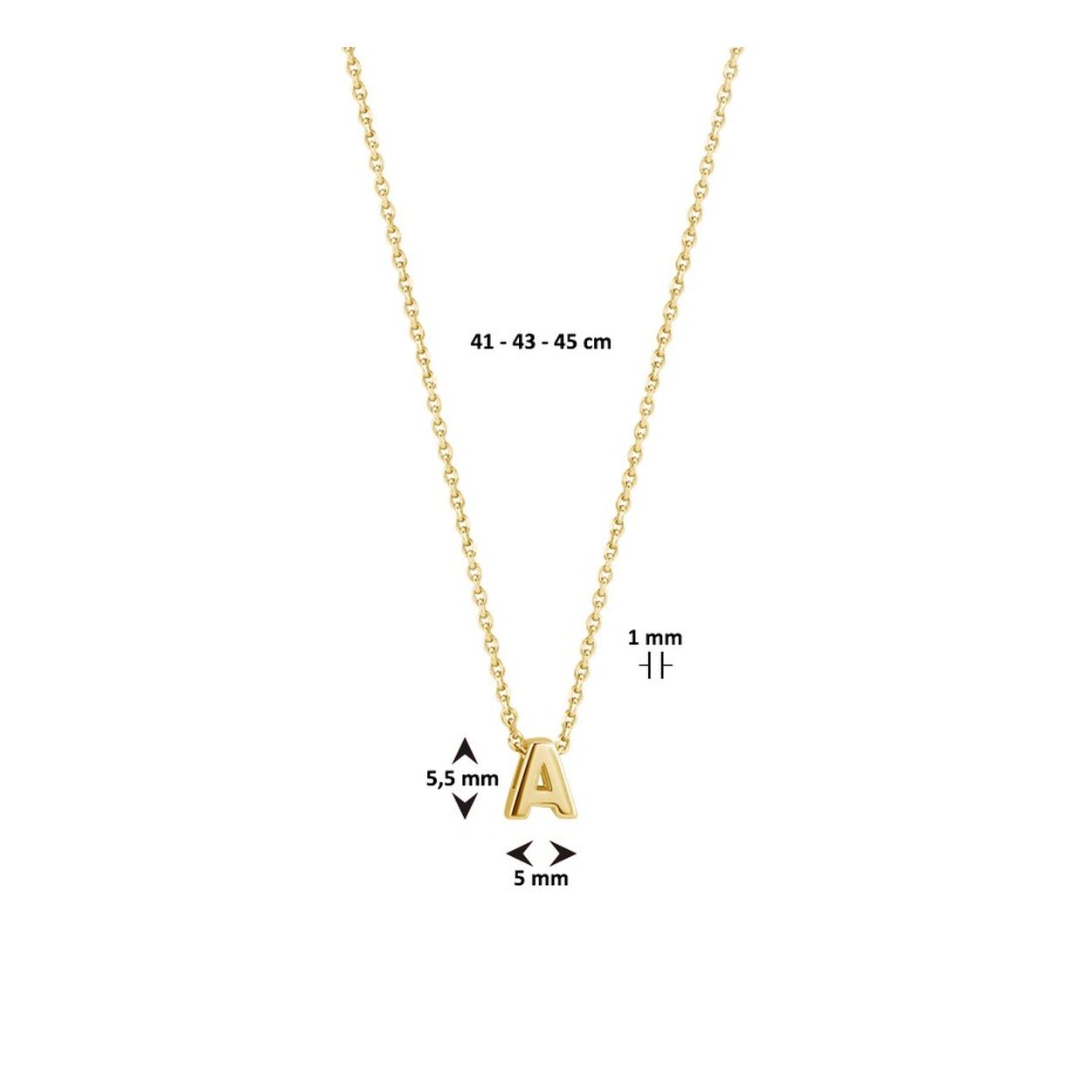 14k Geelgouden anker collier uitgevoerd met de letter A. Het collier heeft draaglengtes van 41, 43 en 45cm. De letter heeft een afmeting van 5.5x5mm.