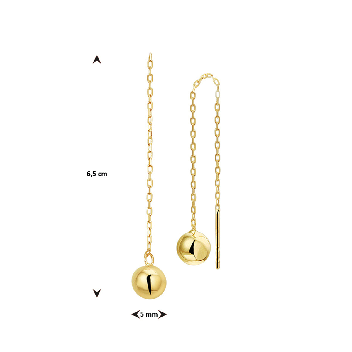 Geelgouden doortrekoorbellen met een lengte van 6.5cm uitgevoerd met een bol van 5mm verbonden door een anker schakel.