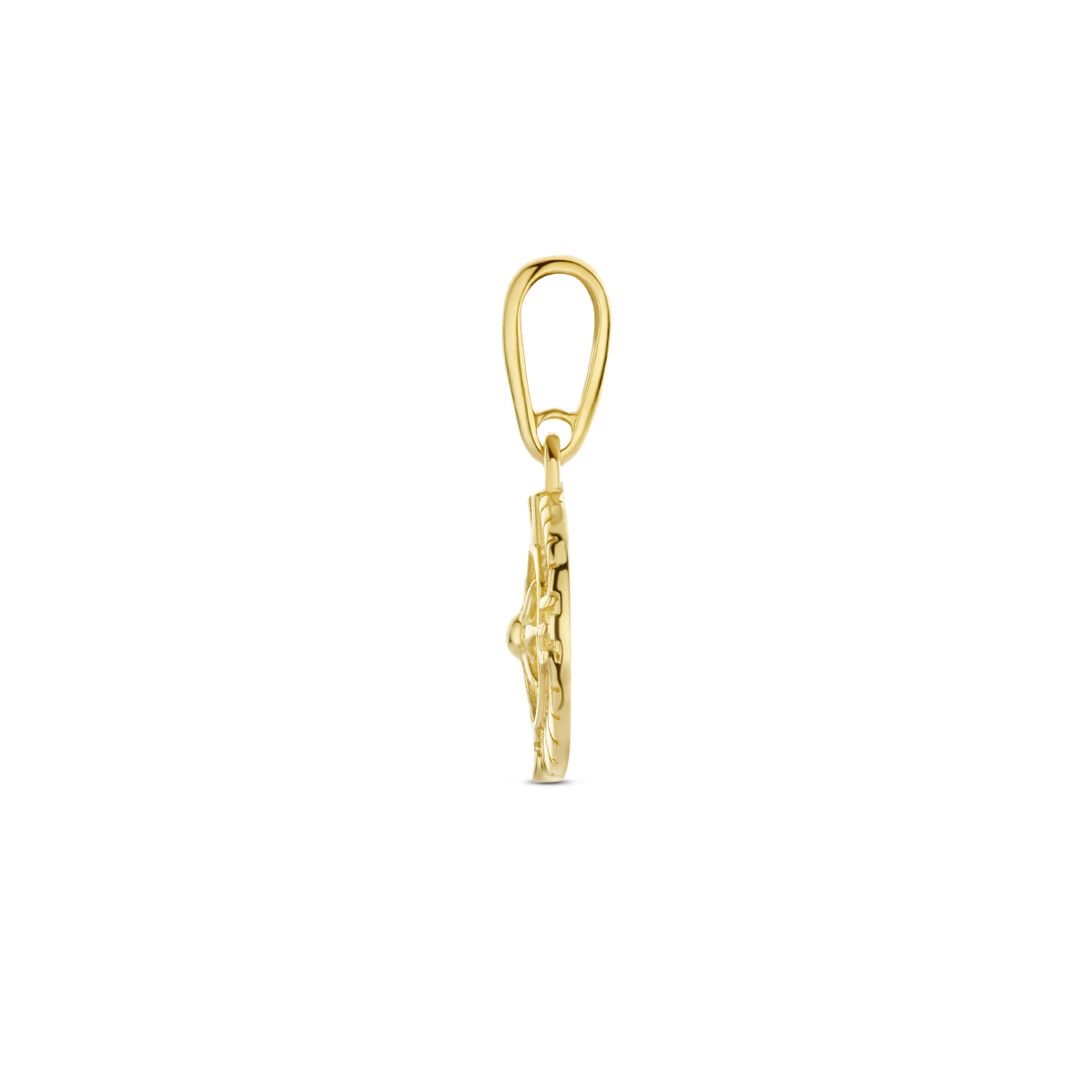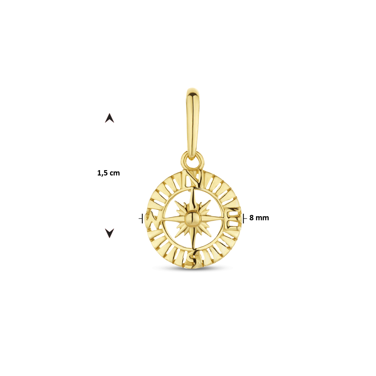 14k Geelgouden hanger in de vorm van een kompas. De hanger heeft een totale hoogte van 15mm.