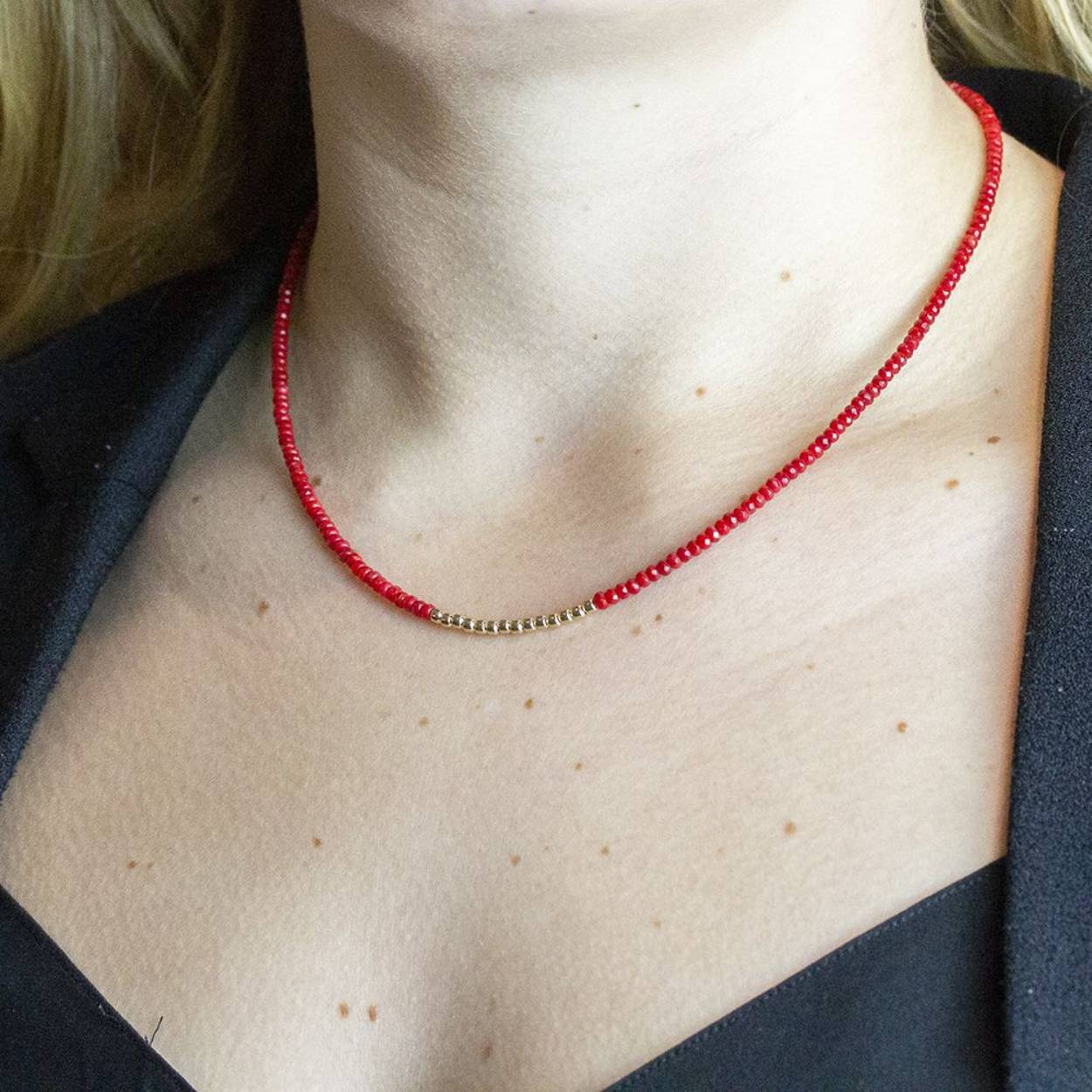 Collier gemaakt met gold filled sluitingen, in combinatie met rode bamboo koraal. Koraal verzacht spanningen en angsten, zorgt voor positieve manieren om samen te leven en geeft gezondheid aan de draagster.