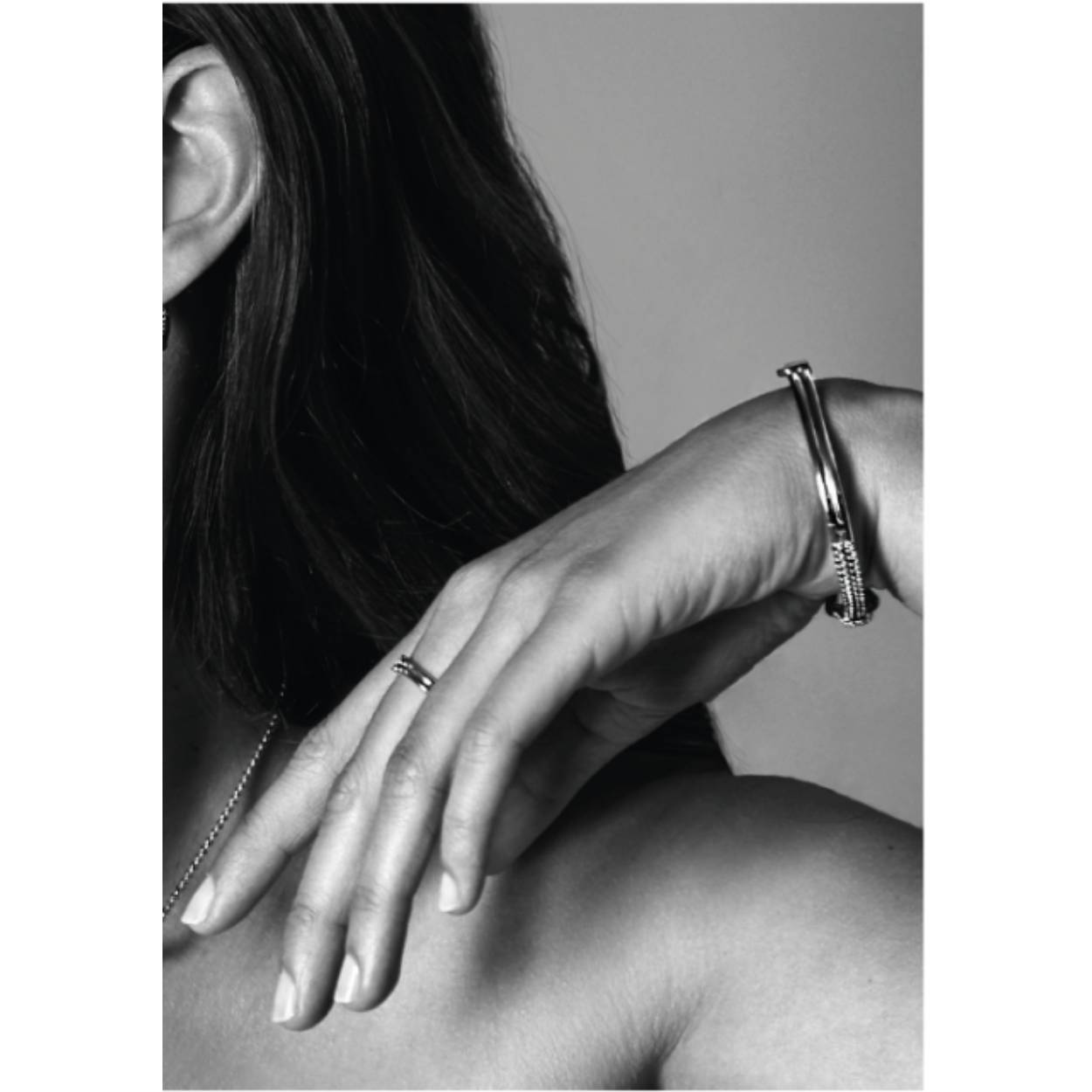 ZINZI zilveren ring met een vloeiende gladde lijn, geknoopt met een scheen bezet met witte zirconia's. Exclusief ontworpen door Mart Visser. Deze ring draagt herkenbaar de signatuur van Mart Visser. Vervaardigd van eerste gehalte zilver (925) en met extra rodiumlaag voor een langdurige glans.