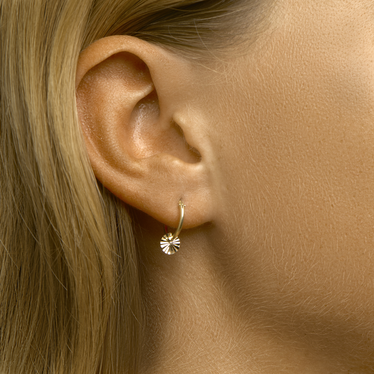 14k Geelgouden oorringen uitgevoerd met een hanger in de vorm van een rondje. De oorringen hebben een afmeting van 13x1.3mm. De hanger heeft een diameter van 6mm.