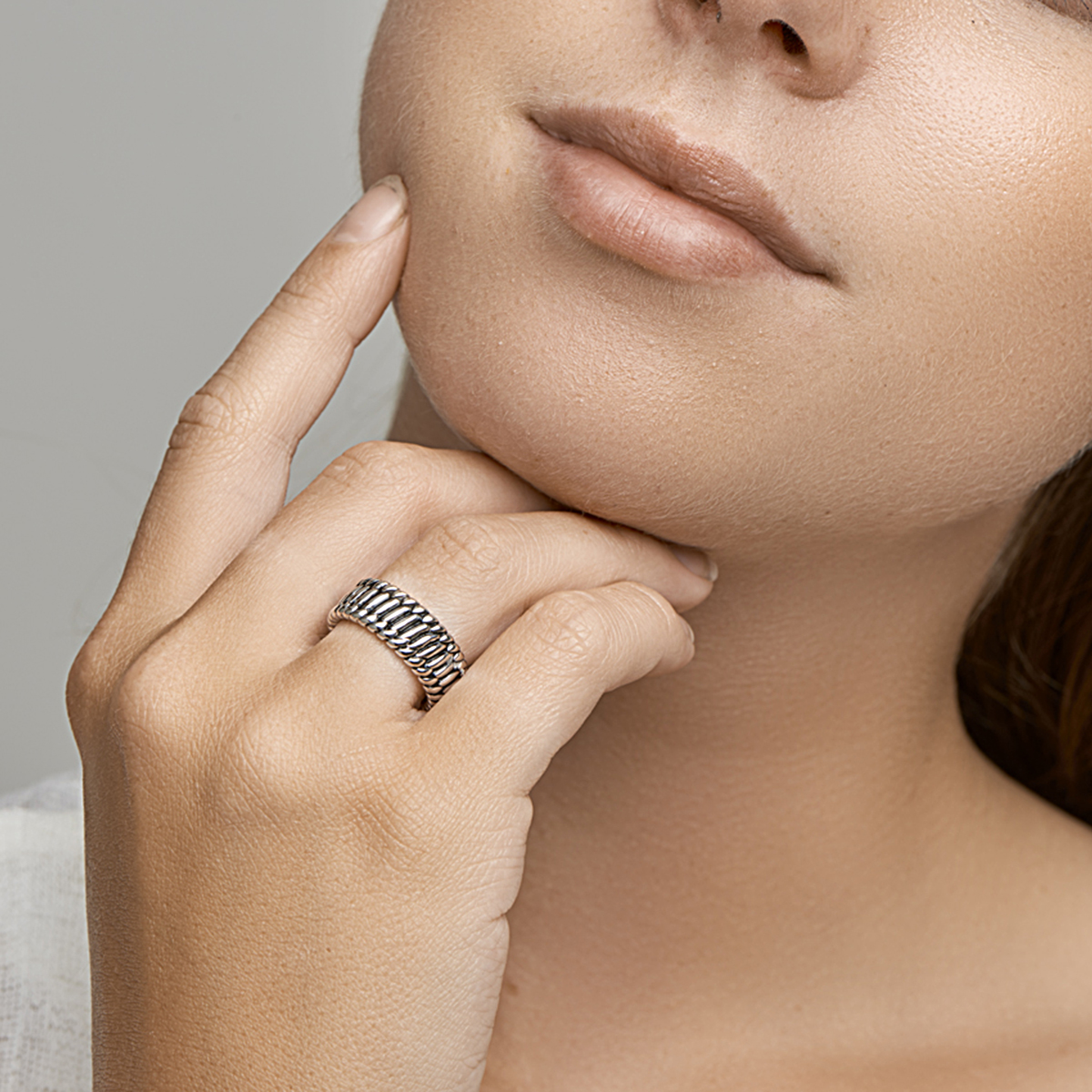 Beschrijving: Stijlvolle geoxideerd zilveren ring met een breedte van 8mm. Minimalistisch design met een exclusieve uitstraling.