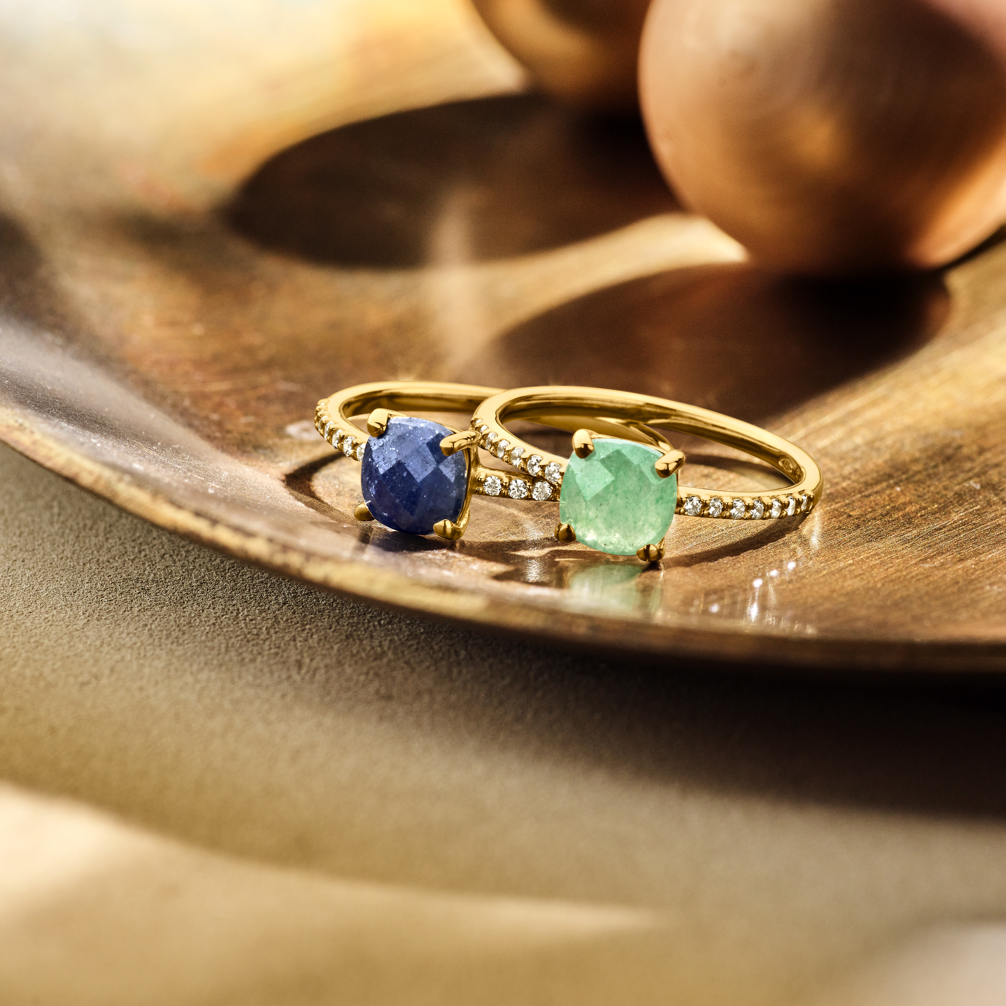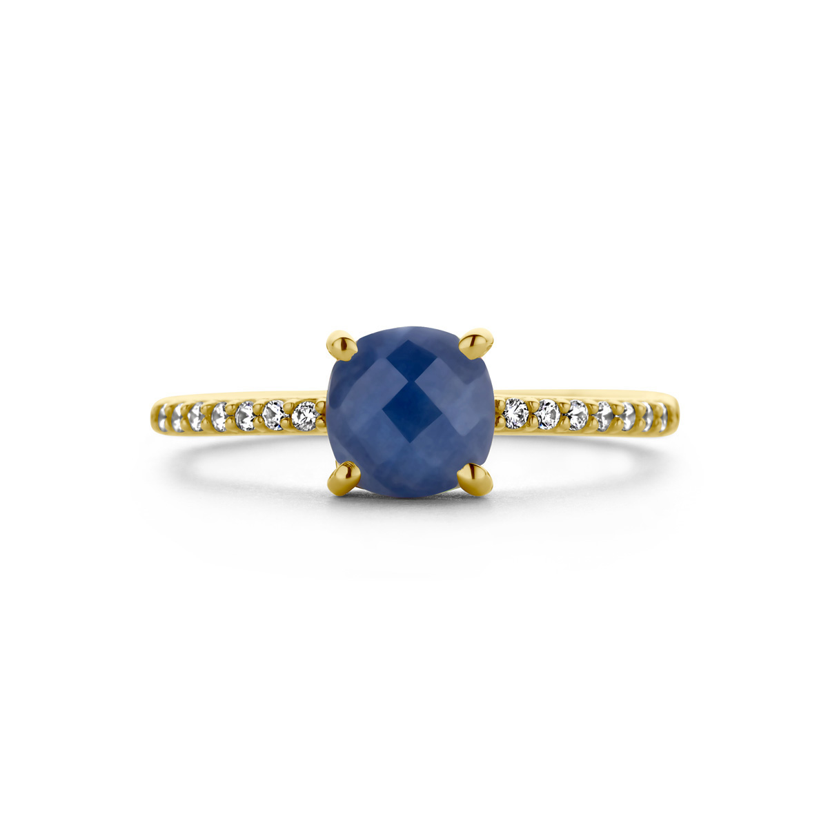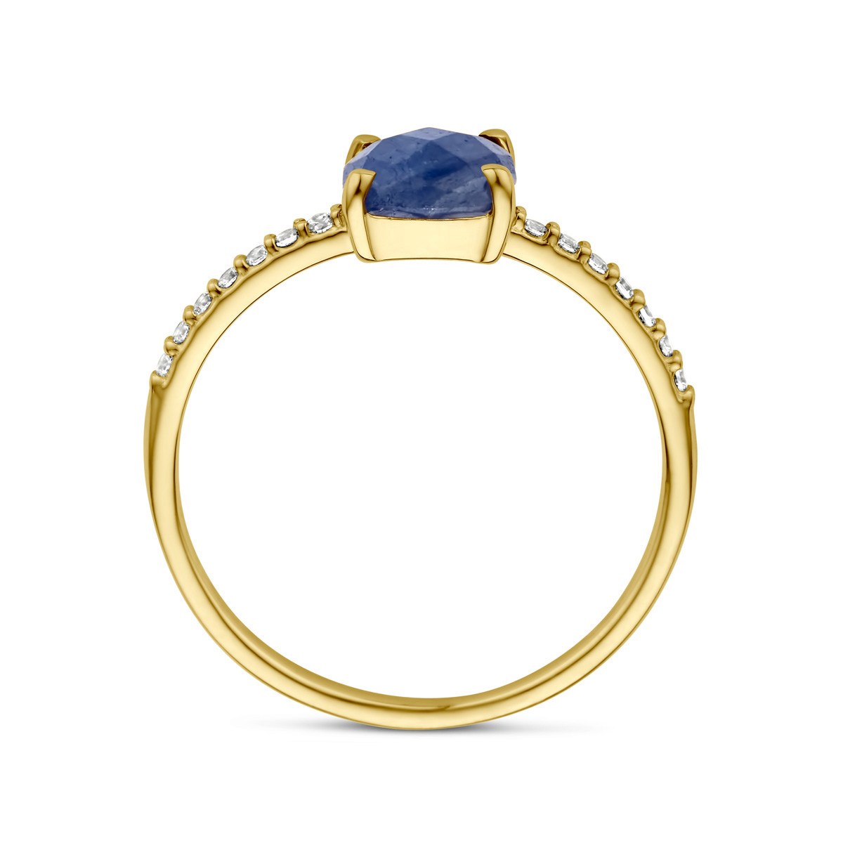 14k Geelgouden ring uitgevoerd met saffier en zirkonia. De saffier heeft een afmeting van 6x6mm.