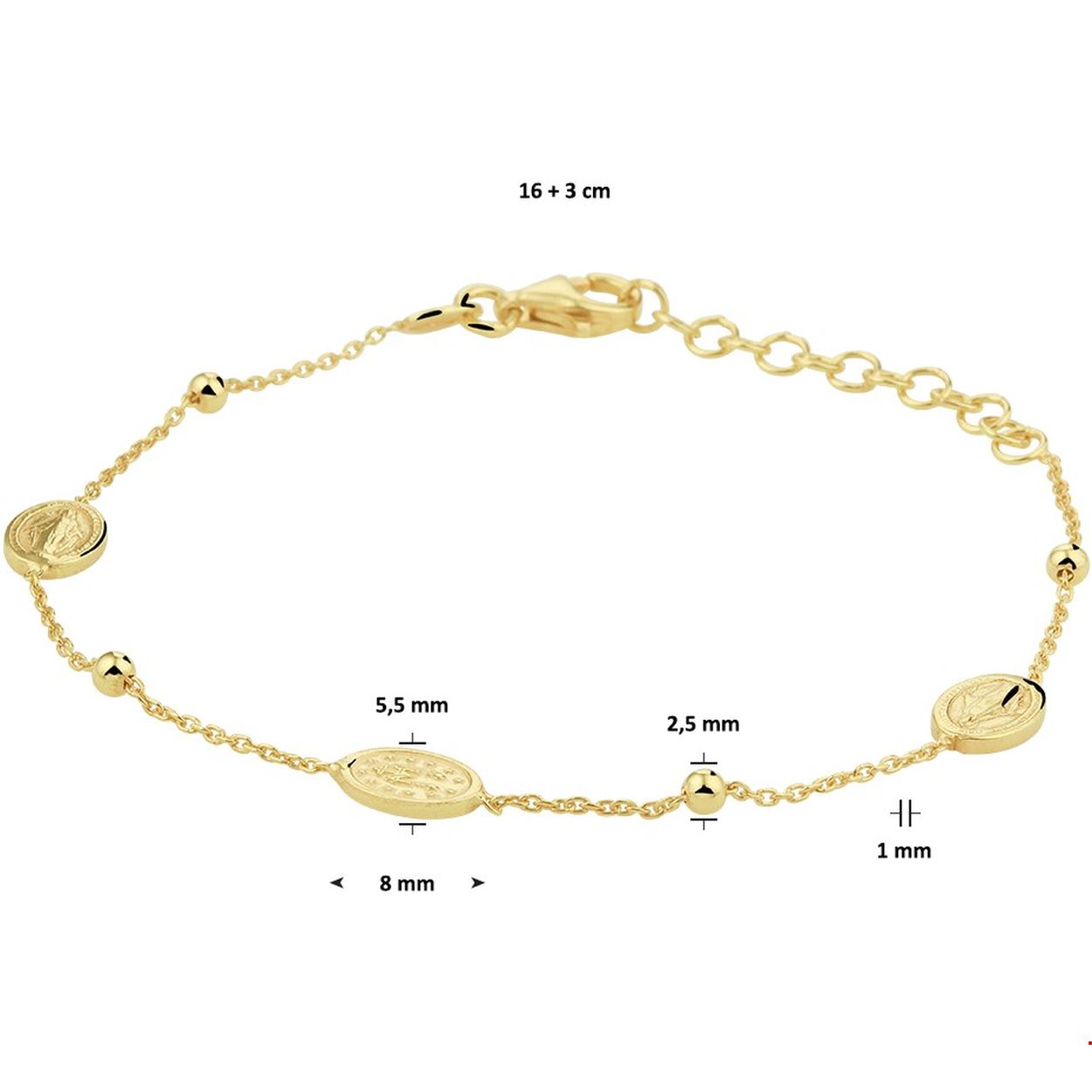 Beschrijving: Vintage geelgoud op zilveren armband met dubbelzijdige scapulier hangers met een afmeting van 5.5x8mm en poli afgewerkte bolletjes van 2.5mm. De armband heeft een draaglengte van 16cm en een extensie van 3cm. Deze armband is uitgevoerd met een stevige karabijn sluiting en geeft je look direct een chique en stijlvolle uitstraling.