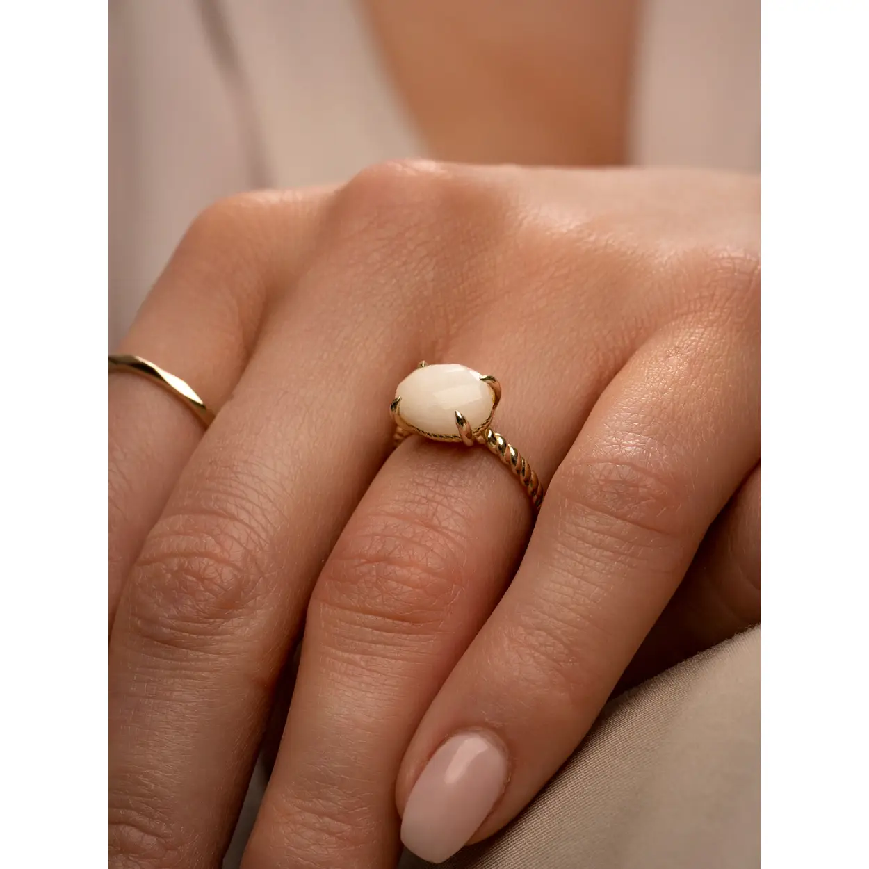 Kenmerkend voor de Twist ringen zijn de ronde vormen en het bekende Twist patroon in de ring. Omdat onze gouden ringen gemaakt zijn van 9 karaat goud, zullen de gouden ringen niet verkleuren. Ze zijn gemaakt van écht goud. De Mother of Pearl Twist ring is een gouden ring met ovale steen van Parel edelsteen.